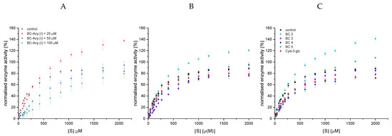 Surprisingly, at higher substrate concentrations, the conversion rate (v0) in the presence of the complex anthocyanin mixture obtained by SPE (BC-ACY, ([I] = 25 µM, 50 µM)), containing five different anthocyanins (BC 1−5) (Figure A1), exceeded v0 observed in the control (Figure 5A). A v0 similar to or higher than the control was also detected for all anthocyanins isolated by preparative HPLC (Figure A1, Table A2) at 12.5 and 25 µM, except for Cyd-3-gal-xyl-glc(fer) (BC 4, Figure 5B,C). As this effect was present in both the complex anthocyanin extract and the individual structures isolated, it must be an artifact independent of the degree of purification. Up to now, we have been unable to explain this data properly. We assume that the presence of compounds not removed during the isolation process acts as co-pigments for CNP, enhancing absorption at 405 nm. This might simulate a higher product concentration and, thus, an increased conversion rate. We interpret the more pronounced effect for the non-acylated structures as a result of the reduced inhibition strength compared to the acylated structures. However, why the BC-ACY (Figure 5A), containing 60% BC 4, shows a much faster conversion is unexplainable, too.