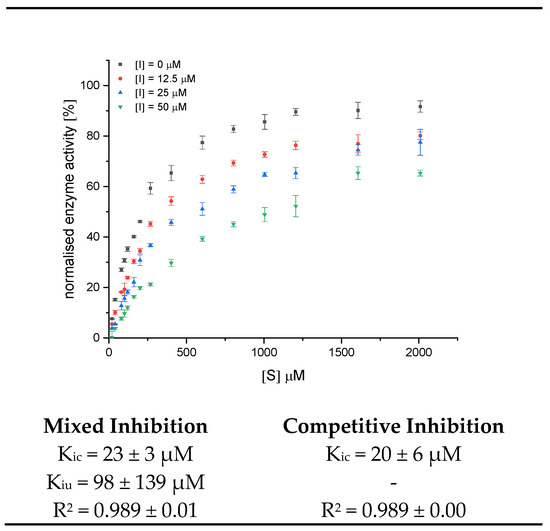 In addition to the Michaelis Menten constant (Km) and the maximal conversion rate (vmax) values (Table S1), inhibition constants (Kic, Kiu) were calculated by fitting the data by two approaches: (i) According to the mixed inhibition equation (Equation (4)) or competitive inhibition equation (Equation (5)), applying an optimal global fit containing data from all inhibitor concentrations including the control ([I] = 0 µM); and (ii) by an independent fit according to the Michaelis Menten equation (Equation (6)), providing the apparent values Kmapp and Vmaxapp (Table S2) for each inhibitor concentration, which were then used to calculate the inhibition constants (Equations (7) and (8)).