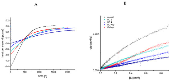 Due to the simulated increase in enzyme activity by addition of black carrot anthocyanins determined by UV/Vis spectroscopy, the inhibitory effect was additionally investigated by ITC to prove the assumed stronger inhibition of α-amylase by acylated structures than by non-acylated anthocyanins. The thermogram, as well as the extracted Michaelis Menten plot, shows a significantly stronger inhibition of BC 4 compared to the non-acylated BC 2 and Cyd-3-glc (Figure 7). For the complex anthocyanin extract, a significant improved inhibition is obvious, to a smaller extent than for BC 4, however. This finding is in contrast to the UV/Vis detection (Figure 5), which simulates an inhibition strength of the mixture equal to non-acylated black carrot anthocyanins. Despite the unapproachability of the inhibition constants (Kic, Kiu), the ITC data demonstrate that the inhibition strength of acylated anthocyanins isolated from black carrot overtakes non-acylated compounds. Furthermore, the impact of a mono- or disaccharide seems to be negligible.
