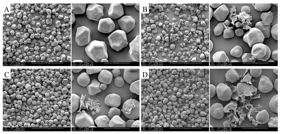 The SEM of corn starch is shown in Figure 1. Figure 1A shows the corn starch particles. Figure 1B–D show the SEM images of samples under 10, 30, and 50 kGy, respectively. In each group of images, starch particles are magnified by 600 times (left-hand images) and 2400 times (right-hand images). Typical corn starch particles are polyhedrons with smooth corners, and some immature particles are spherical (Figure 1). The particle surface is slightly uneven due to small pits and small holes at the center of the particles. Corn starch particles after EBI treatment are broken. Starch appearance is destroyed with increasing irradiation dose. Hu et al. found that some starch particle surfaces cracked and displayed rough surfaces when the irradiation dose reached 4.4 kGy []. Sokhey et al. discovered from SEM that the γ-irradiation dose of 31 kGy did not destroy the physical structure of waxy corn starch particles, and damages to starch particles under irradiation altered the molecular structure of starch []. Chung et al. conducted a further study and confirmed that waxy corn was substantially influenced by γ-irradiation, thereby indicating that amylopectin was the starch component that was predominantly affected by irradiation. Amylopectin was broken down into short amylose after γ-irradiation []. Moreover, the morphology of starch particles remained unchanged after irradiation. This outcome might be due to the fact that irradiation energy reaches internal starch crystals. These results differed from those in the present study, and such variation might be related to the different proportions of amylose and amylopectin in corn. The corn samples used in the current research have lower amylopectin content than waxy corn, and irradiation energy destroys the apparent structure directly.