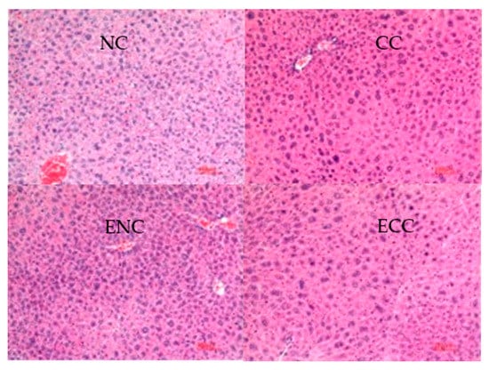 Variations of the organ weights and organ indexes of the ICR mice at 10 weeks are shown in Table 6 and Table 7. Compared with the NC group, the CC group showed slightly higher liver, kidney, and spleen indexes but a lower testis index. However, no significant difference occurred between the two groups. The liver index of the ECC group was higher than those of other groups. In a word, all groups showed no significant differences in organ weights and organ indexes. Conkova et al. [] fed FDRL Wistar rats with ZEN-containing fodders for 104 weeks (0, 0.1, 1, and 3 mg/kg b.w./day). The organ weights of male and female mice of the highest-dose group increased significantly. Compared with the above studies, the concentrations of contaminated fodders used in this experiment were relatively low and failed to cause significant changes to the organ weights and organ indexes of mice in the experiment. Moreover, EBI did not cause significant changes to the organ weights and organ indexes of ICR mice.