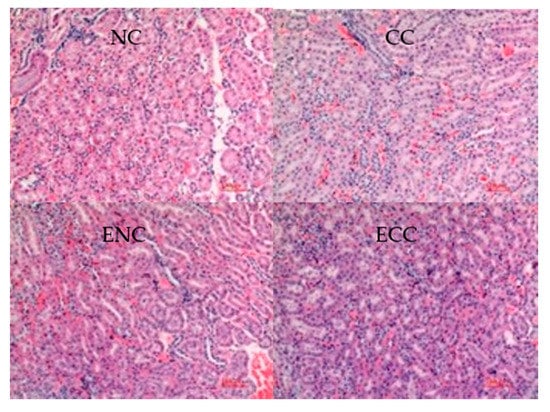 ZEN and OTA may cause a series of histopathological liver and kidney changes. Therefore, observing the pathological changes of liver and kidney tissues of mice can be an effective way to evaluate EBI’s effects on the toxicity changes of a mycotoxin. In this study, the pathological liver and kidney changes of ICR mice were examined. Liver histopathological tissue sections of different groups are shown in Figure 2. Compared with those of the NC group, the liver tissues of the CC group presented slight nuclear heteromorphism and nuclear swelling. These phenomena were not observed in other groups. Liang et al. found fatty degeneration of hepatic cells and focal necrosis in the ZEN group. Few lymphocyte infiltrations were observed from some sections []. In renal histopathological tissue sections of ICR mice (Figure 3), the CC group developed no evident lesion compared with the NC group. Renal tissues of all groups remained relatively normal.