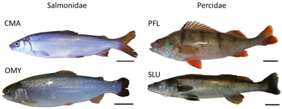Illustration of the species used in this study. 15 fishes of two salmonid species Coregonus maraena (CMA) and Oncorhynchus mykiss (OMY) as well as two perciforms Perca fluviatilis (PFL) and Sander lucioperca (SLU) were analyzed. Scale: 5 cm.