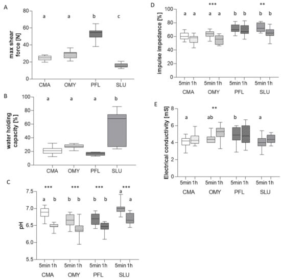 Overview of fish flesh quality analysis. Box–whisker plot of maximal shear force (A), water-holding capacity (B), pH value (C), impulse impedance (D) and electrical conductivity (E) are illustrated for Coregonus maraena (CMA) and Oncorhynchus mykiss (OMY) as well Perca fluviatilis (PFL) and Sander lucioperca (SLU). PH value (C), impulse impedance (D), and electrical conductivity (E) were measured five minutes and one hour after slaughter. Means with different superscript letters differ significantly between the animal groups (p < 0.05). Additionally significant differences within one fish species over time are shown as * p < 0.05, ** p < 0.01 and *** p < 0.001.