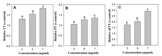 The concentration-dependent anti-coagulation activities of TE extract. (A): TT changes by TE extract, (B): PT changes by TE extract, (C): aPTT changes by TE extract. Different superscripts within a panel indicate statistically significant differences (p < 0.05).