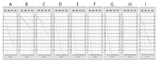 Impedance changes during platelet aggregation after addition of aspirin and the insect extracts in whole blood aggregometer. (A) DMSO, (B) aspirin (0.25 mg/mL), (C) aspirin (0.125 mg/mL), (D) AD extract (0.25 mg/mL), (E) TM extract (0.25 mg/mL), (F) PB (0.25 mg/mL), (G) GB extract (0.25 mg/mL), (H) TE extract (0.25 mg/mL) and (I) AM extract (0.25 mg/mL), respectively.