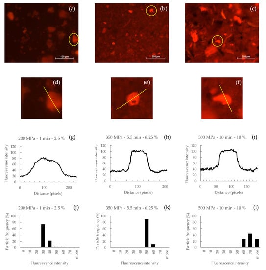 To analyze the florescence intensity the images corresponding to the lower (200 MPa, 1 min, 2.5%), central (350 MPa, 5.5 min, 6.25%), and higher (500 MPa, 10 min, 10%) treatments were selected. The particle with greater intensity was selected to generate intensity profiles (Figure 1a–c). A line (shown in yellow) was drawn across the particle, and a plot (graph) was generated to show the intensity values of the pixels along the line (Figure 1d–i). In addition, Figure 1j–l shows the relation between the percentages of particles at each fluorescence intensity interval.