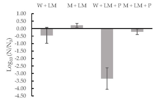 Inactivation level of ingredients’ different combinations: peptone water (W), milk (M), inoculated Listeria monocytogenes (LM), and pomace (P).