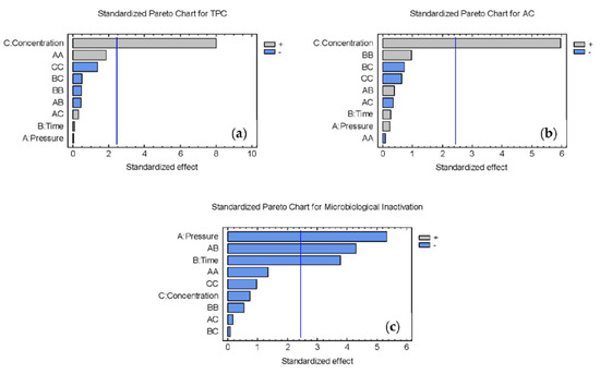 The optimum treatment conditions are the same as those of the experimental design. When comparing the results in Table 2 with the predicted values in Table 3, we see that experimental results are like the predicted values through optimization. Therefore, the RSM is proven to be a reliable tool to predict the behavior of the sample studied in terms of AC, TPC, and microbial inactivation.