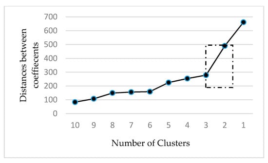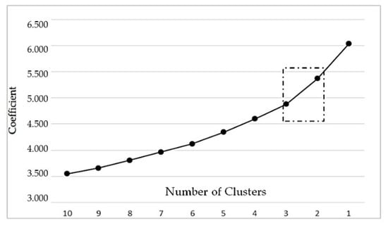 The cluster analysis was executed in several steps. In the first step, the nearest neighbor method (single-linkage method) was applied to eliminate outliers. The squared Euclidean distance was chosen as the measurement interval. In this regard, eleven outliers were identified and removed from the data set. Then, Ward’s method was executed to create groups that obtained the highest heterogeneity between groups and the lowest homogeneity within groups [21]. In this context, the agglomeration schedule was used to identify the highest increase of heterogeneity when creating or removing an additional cluster. For this purpose, an analysis of the coefficients from the agglomeration schedule and the distances between the coefficients was executed. In this regard, line diagrams added in the appendix were used. It is especially noticeable in the line diagram with the distances of the coefficients that a three-cluster solution is appropriate, because at this point (decrease from 3 to 2 clusters) the highest slope can be observed (Figure 1 and Figure 2). In order to maintain an appropriate heterogeneity between the groups, this group formation makes the most sense.