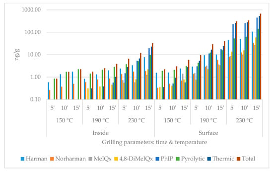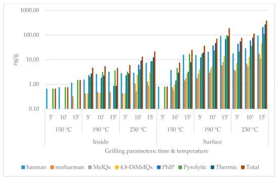 During the quantitative chemical analysis, two pyrolytic (harmane, norharmane) and three thermic (MeIQx, 4,8-DiMeIQx, PhIP) HCAs were detected. The data set contains the individual results of the compounds and the summarized pyrolytic, thermic and total HCA amounts (Figure 1, Figure 2, Figure 3 and Figure 4). For each group, five heat treatment parameters were defined and tested: (1) presence of skin (with or without); (2) position of the top plate (opened or closed); (3) dividing the surficial parts from the inside of the slices (inside or surface/skin); 4 temperature (150, 190, or 230 °C); and (5) duration (5, 10, or 15 min).