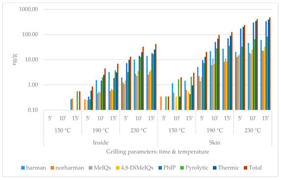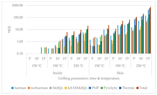 The compounds and amounts of HCAs formed exhibited some differences based on the temperatures applied. While on 150 °C, the thermic ones, especially harmane, were typically the most frequently detected HCA component. On higher temperatures, PhIP dominated the HCA profiles: on 230 °C 15 min, it always made up of more than 50% of the total HCA ratio in the surface and the skin. MeIQx was usually the least detectable: in three cases of inside samples (opened without skin; closed with and without skin), its amount was even less than the limit of quantification (0.08 ng/g) at 150 and 190 °C. The formation did not seem to be significantly affected by the presence of skin or the top plate.