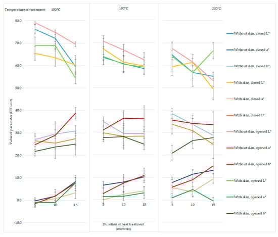 The changes of CIELAB (International Commission on Illumination) values (L*, brightness; a*, redness; b*, yellowness) by the heat treatment conditions: temperature, duration, presence of skin, and position of upper grill plate. The meaning of the values is explained in the section of materials and methods.