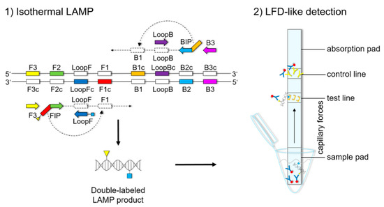 Alternatively, the implementation of lateral flow devices (LFDs) as detector tools improves the visualization of LAMP products (LAMP-LFD), based on, for example, biotin and fluorescein isothiocyanate (FITC)-labeled LAMP amplicons and gold-labeled anti-FITC antibodies [32]. Here, generated gold-labeled amplicon-antibody complexes are trapped at the test line and residual unbound gold-labeled antibodies are trapped at the control line.