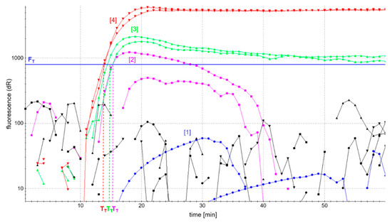 The analysis of LAMP amplicons using AGE showed successful amplification patterns, comparable to those depicted in Figure 3c, and independent of the four different primer ratios investigated. However, the development of fluorescence was dependent on the concentration of labeled primers (Figure 2). The use of fully labeled primers (blue curve) completely quenched fluorescence. By contrast, the fluorescence intensity of atpA LAMP reactions increased with decreasing concentrations of labeled primers. The onset of the detectable fluorescence increase (dR) of atpA LAMP reactions with all combinations of partially labeled primers started almost simultaneously after around 15 min of incubation time. In all further experiments, an FIP/biotin-FIP primer ratio of 1:1 and LoopF/FITC-LoopF primer ratio of 1:3 (Figure 2, red curve) was used, since it enabled the highest fluorescence development in real-time monitoring of all investigated ratios of primer labeling.