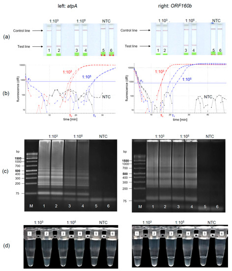 Duplicate detection of LAMP DNA products of the optimized atpA (left) and ORF160b (right) LAMP assays using (a) the lateral flow dipstick (LFD); (b) real-time fluorescence based on SYBR Green I; (c) agarose gel electrophoresis (AGE); (d) visual inspection via turbidity formation. (b: red curves: 1:103 diluted DNA; blue curves: 1:105 diluted DNA; black curves: NTC).