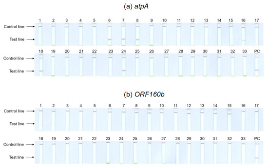 Specificity of (a) the atpA and (b) the ORF160b LAMP-LFD assays for the detection of allergenic soybean. Cross-reactivity testing with undiluted DNA. Numbers according to Table 1 (PC: positive control tofu).