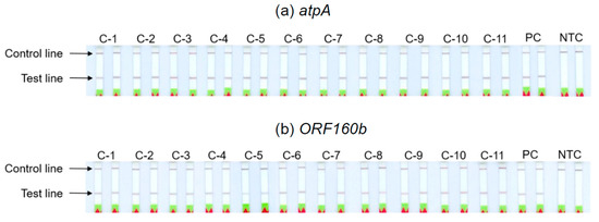 Screening of different soybean cultivars using (a) the atpA and (b) the ORF160b LAMP-LFD assays. Duplicate analysis of 1:105 diluted DNA (equivalent to 10 mg soybean per kg food) of the 11 soybean cultivars C-1 to C-11 according to Table 2 (PC: positive control yellow soybean (Schoenenberger®® Hensel®®); NTC: no template controls).