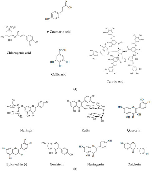 Structure of polyphenolic (a) and flavonoid compounds (b) identified in M. charantia and M. lucida leaves extracts.