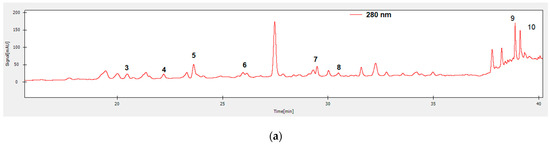 HPLC-DAD chromatograms of M. charantia methanol/1% HCl extract with detection at 280 nm (a) and 320 nm (b). Peaks identified were: 3—chlorogenic acid, 4—epicatechin, 5-p-coumaric acid, 6—daidzein, 7—rutin, 8—naringin, 9—naringenin, 10—genistein.