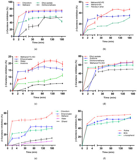 Inhibition of β-Carotene bleaching was determined according to the method characterized in the literature [26]. β-carotene/linoleic acid stock emulsion solution was made by dissolving 4 mg of β-carotene in 20 mL of chloroform, to which 500 μL of linoleic acid and 4 g of Tween 40 were added. Chloroform was entirely evaporated using a vacuum evaporator. Subsequently, 100 mL of miliQ water were added, the resulting emulsion was stirred vigorously. An amount of 50 μL of solubilized extract in methanol (1000 μg/μL) and reference compounds (BHA, rutin and α-tocopherol) at 100 μg/μL, were introduced in a 96-well polypropylene microwell plate. An amount of 250 μL of the above emulsion was added to the extracts and reference compounds samples. A blank consisting of 50 μL of solvent and 250 μL of the emulsion was prepared. The plate was subjected to constant orbital shaking at 660 cycles/min (1 mm amplitude) at 40 °C for the 60 s. A single reading was made at the end of each shaking cycle. The decolorization kinetics of the emulsion in the presence and absence of antioxidant was monitored at 460 nm at time intervals (2, 5, 10, 30, 60, 90, 120, 150 and 180 min) with the same amplitude orbital stirring.