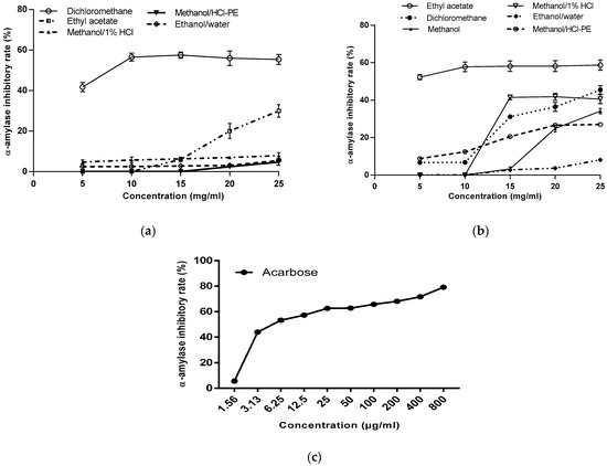 Concerning M. lucida extracts, half of the analyzed extracts showed inhibition of α-amylase activity (Figure 5b). Among these extracts, ethyl acetate extract demonstrated comparatively higher α-amylase inhibitory activities (58.76 ± 2.74%) with IC50 value of 5 mg/mL. At 25 mg/mL, the ethanol/water extract had the lowest inhibition percentage (8.10 ± 2.76%). The data analysis revealed that the interaction between the extracts inhibition potency and their concentration is significant (p < 0.0001). As shown in Figure 5, degradation of starch by α-amylase was inhibited by the both plants extracts and acarbose used as standard molecule. Whereas, acarbose exhibited stronger inhibitory activity against α-amylase compared to the plants extracts.