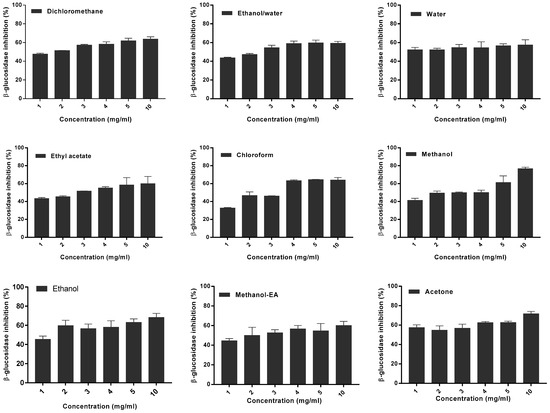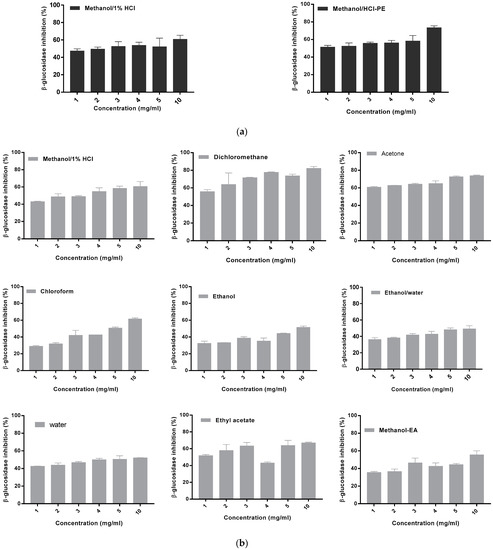The plant extracts have shown various inhibition percentages of β-glucosidase activity. A significant number of extracts showed an inhibitory activity of 50% or more in dose-dependent manner. Figure 6a shows the results of β-glucosidase activity inhibition by M. charantia extracts. The highest inhibitory activity (76.74 ± 1.60%) was presented by the methanolic extract at 10 mg/mL while the lowest (32.73 ± 0.53%) was obtained for the chloroform extract at 1 mg/mL. The data analysis shows that the inhibition percentages of M. charantia extracts vary according to the solvent used in extraction (p <0.0001). The interaction between the extract types and different concentrations is significant (p = 0.0015).