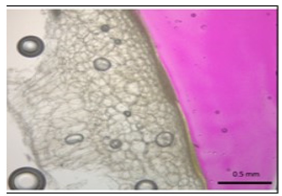 Dried sample section obtained after being immersed in the alkaline solution and phenolphthalein in order to determine the penetration of the alkaline solution. The phenolphthalein turned bright magenta with alkaline solutioncontact; structure viewed at 40× magnification microscopy. The figure shows no alkaline solution penetration in the sample.