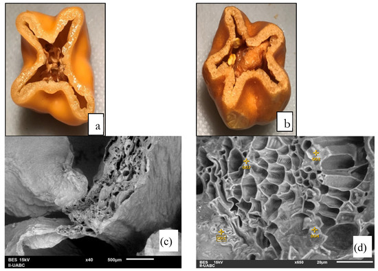 Images of fresh and freeze-dried habanero pepper: (a) before freeze-drying, (b) after freeze-drying, (c) SEM image of dried sample at 40×, (d) the place where energy-dispersive X-ray analyses (EDX) were performed (650×) for a dried sample.