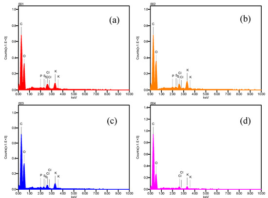 Figure 3 shows the energy-dispersive X-ray analysis. It can be seen that the spectra are composed mainly of carbon and oxygen, follow bypotassium and chlorine, and little quantities of phosphorus and sulfur (in this hierarchy, according to peak intense) [24,25].
