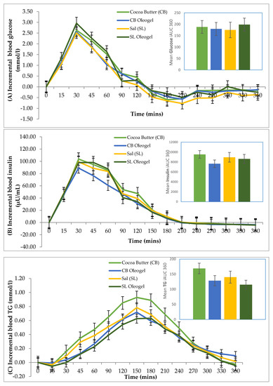 Similar to a previous study by Tan et al. (2017) [23], our results showed that there was a significantly lower increase in plasma insulin and TG of the brownie incorporated with CBOG and SLOG compared to the brownie with CB and SL. It is interesting to note that similar metabolic effects were obtained despite CB and SL containing higher amounts of palmitic and stearic acid, as compared to coconut oil, which contained mostly lauric and myristic acid (Table 2). The results from this study indicate that, independent of the degree of saturation or chain length, the conversion of oils into oleogels significantly attenuates postprandial insulin and TG levels.
