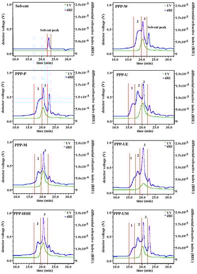 Extraction methods can influence molecular weights, viscosities, and monosaccharide compositions of polysaccharides, which can also affect the bioactivities of polysaccharides [17,33]. Accordingly, Mw, viscosities, and monosaccharide compositions of PPPs extracted by seven extraction methods were studied. Figure 1 shows the HPSEC-RID-UV chromatograms of PPPs. The results indicated that molecular weight distributions of PPPs were influenced by various extraction processes significantly. Three fractions (fractions 1 to 3) have been found in PPP-U, PPP-UE, and PPP-UM, but only two fractions (fraction 2 and fraction 3) have been found in PPP-W, PPP-P, PPP-M, and PPP-HSH. Furthermore, the UV (280 nm) signals were found in fraction 2 and fraction 3, indicating that phenolic compounds and proteins might bond on polysaccharide fractions. Table 2 summarized the Mw of fraction 2 and fraction 3 in PPP-W, PPP-P, PPP-M, and PPP-HSH, which varied from 4.905 × 104 to 9.170 × 104 Da and from 0.794 × 104 to 1.763 × 104 Da, respectively. The fraction 1 in PPP-U, PPP-UE, and PPP-UM might be correlated with the release of polysaccharides because of ultrasonic processes [15], and molecular weights of fractions 1 to 3 in PPP-U, PPP-UE, and PPP-UM varied from 2.768 × 105 to 3.612 × 105 Da, from 7.563 × 104 to 9.113 × 104 Da, and from 1.078 × 104 to 1.865 × 104 Da, respectively. Results indicated that the molecular weights of PPP-U, PPP-UE, and PPP-UM obtained by ultrasonic treatments were much higher than those of PPPs obtained by other methods. Moreover, the polydispersities of fraction 2 and fraction 3 in PPP-W, PPP-P, PPP-M, and PPP-HSH varied from 1.083 to 1.702 and from 1.074 to 1.138, respectively, which matched with the HPSEC-RID chromatograms. The polydispersities of fractions 1 to 3 in PPP-U, PPP-UE, PPP-UM varied from 1.155 to 1.161, from 1.076 to 1.349, and from 1.104 to 1.154, respectively, which also matched with the HPSEC-RID chromatograms.
