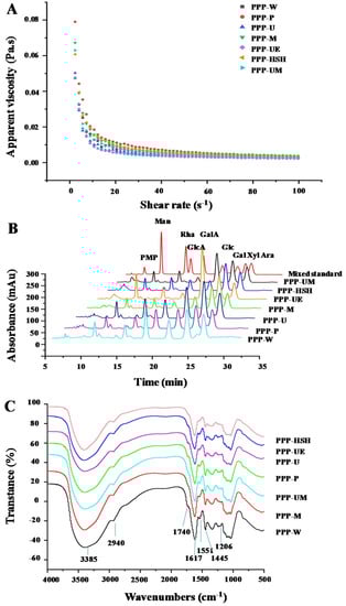 Dependences of apparent viscosities on the shear rate (A), high performance liquid chromatography profiles (B), and FT-IR spectra (C) of PPPs. The codes of samples were the same as in Table 1; PMP, 1-phenyl-3-methyl-5-pyrazolone, Man, mannose; Rha, rhamnose; GlcA, glucuronic acid; GalA, galacturonic acid; Glc, glucose; Gal, galactose; Xyl, xylose; Ara, arabinose.
