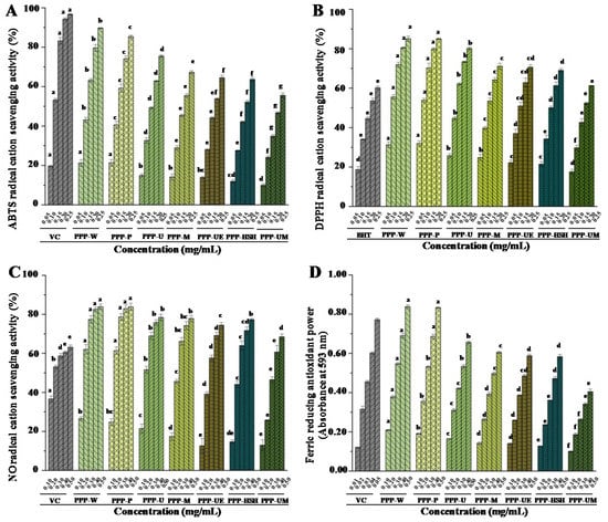 ABTS (A), DPPH (B), and nitric oxide (C) radical scavenging activities, as well as ferric reducing antioxidant powers (D) of PPPs. The codes of samples were the same as in Table 1; ABTS, 2,2′-azino-bis(3-ethylbenzthiazoline-6-sulphonic acid); DPPH, 2,2-diphenyl-1-(2,4,6-trinitrophenyl) hydrazyl; Vc, vitamin C; BHT, butylated hydroxytoluene; The error bars are standard deviations; Significant (p < 0.05) differences are shown by data bearing different letters (a–h); Statistical significances were performed by ANOVA and Duncan’s test.