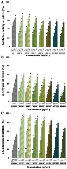 Inhibition activities on AGEs (A), and inhibitory activities on α-amylase (B) and α-glucosidase (C) of PPPs. The codes of samples were the same as in Table 1; AG, aminoguanidine; AGEs, advanced glycation end products; The error bars are standard deviations; Significant (p < 0.05) differences are shown by data bearing different letters (a–h); Statistical significances were performed by ANOVA and Duncan’s test.