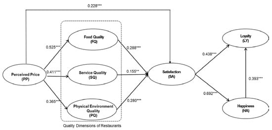 As shown in Table 6, 10 hypotheses were statistically significant. Perceived price (β = 0.228, p < 0.001), food quality (β = 0.288, p < 0.001), service quality (β = 0.155, p < 0.01), and physical environment quality (β = 0.280, p < 0.001) were positively related to customer satisfaction, supporting H1, H2, H3, and H4. The findings for H5, H6, and H7 demonstrated that perceived price had positive effects on food quality (β = 0.525, p < 0.001), service quality (β = 0.411, p < 0.001), and physical environment (β = 0.365, p < 0.001), which supported H5, H6, and H7. The data also indicated that customer satisfaction could positively influence customer loyalty (β = 0.438, p < 0.001) and happiness (β = 0.692, p < 0.001); therefore, H8 and H9 was supported. Furthermore, the coefficient between happiness and customer loyalty was 0.393 (p < 0.001), which indicated that happiness could positively impact loyalty, so H10 was supported (Figure 1).