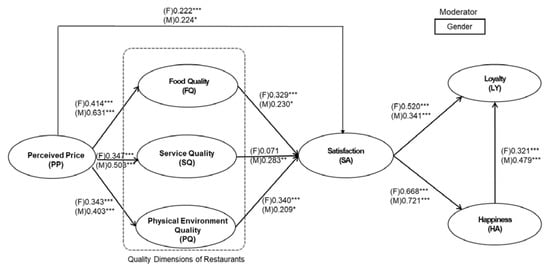 Gender moderates the relationships between perceived price, service quality, food quality, physical environment quality, customer satisfaction, loyalty, and happiness.