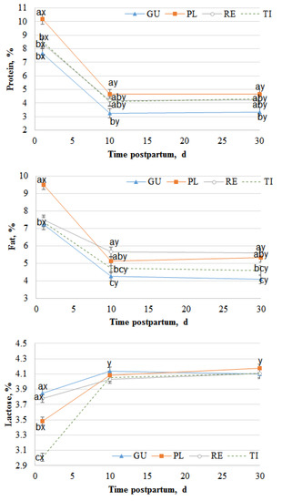 The chemical composition of natural milk through the first 30 days of lactation is shown in Figure 1. The milk protein percentage was significantly affected by breed and time of lactation (P < 0.0001). However, the milk fat and lactose percentages were affected by the interaction between breed and time of lactation (P < 0.0001).