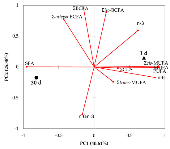 Two principal component analyses were performed with the main fatty acid groups of both milk and meat. The variables included in these principal component analyses were SFA, MUFA, PUFA, n–3, n–6, n–6:n–3 ratio, ΣCLA, Σiso-BCFA, Σanteiso-BCFA, ΣBCFA, cis-MUFA, and Σtrans-MUFA.