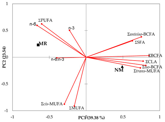Principal component analysis of the main groups and branched fatty acids of meat of kids reared with milk replacers (MR) or natural milk (NM). SFA, saturated fatty acids; BCFA, branched chain fatty acids; MUFA, monounsaturated fatty acids; CLA, conjugated linoleic acid; PUFA, polyunsaturated fatty acids.