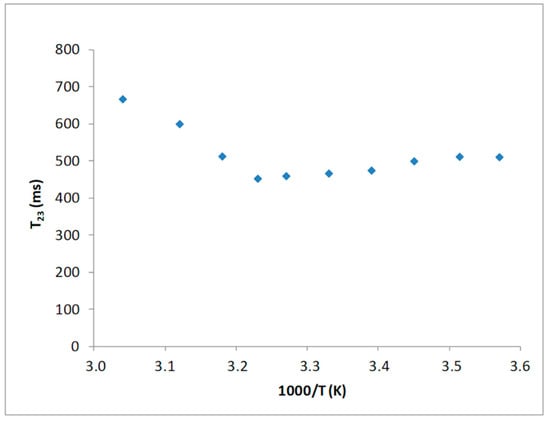 Several works reported for water molecules not undergoing proton chemicals exchange a linear relationship of the proton spin-spin relaxation time with the reciprocal of the temperature [27,28]. Indeed, a T2 minimum is expected if the chemical exchange mechanism is the main contribution to relaxation. In a temperature range from 277 to 323 K, such a behavior has been displayed by the T23 component, as reported in Figure 1.