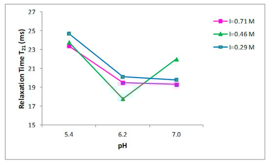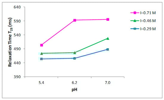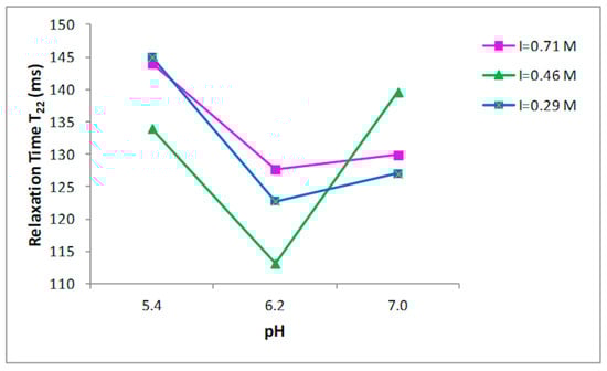 Both the ionic strength and pH are reported to influence the water-holding capacity [29,30,31]. This behavior has been attributed to the effect of the pH on the net charge of the proteins, which determines the amount of water in these structures [32]. A strong effect of both the ionic strength and the pH on the distribution of T2 relaxation times was observed as reported in Figure 2, Figure 3 and Figure 4.