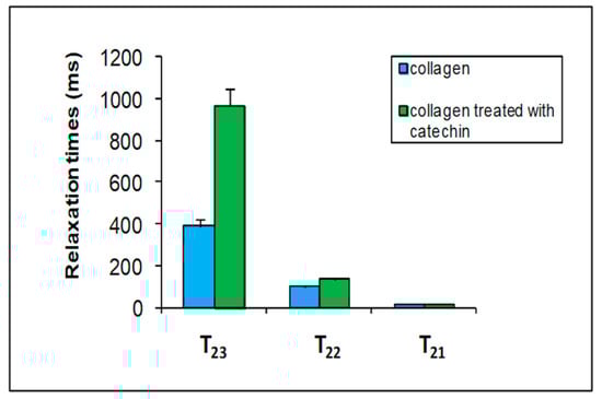 Catechin strongly affects the T22 and T23 water relaxation times of collagen. As mentioned before, the intermediate T22 was attributed to the water fraction in the interfibrillar space, and the third fraction (T23) corresponded to the free water fraction. These results indicate that catechin has been able to interact with collagen both on the fibrillar surface and inside the interfibrillar space. Water T23 relaxation value increases when the catechin is bound to the surface of collagen. This result could indicate that water interacts less with the surface of the polymer due to the formation of a complex between the catechin and collagen.