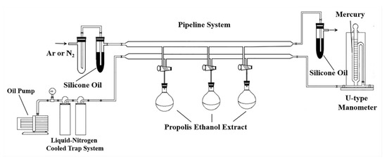 Pulse sequences for solvent suppression such as noesypr-1d and zgpr are commonly applied to suppress the water peak. However, the blurring signals and the tilting baselines near the peaks of organic solvents and water cause errors in analyzing and integrating spectra. Therefore, the Schlenk line (Figure 2) was used to remove organic solvents and water residuals under reduced pressure using an oil pump at room temperature for 6.0 h. After distillation, argon was injected into round flasks to prevent sample oxidation. After dissolving in 0.70 mL CDCl3, each sample was transferred into 5 mm outer diameter NMR tubes for NMR analysis.