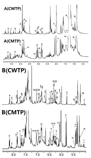 Typical 600 MHz 1H NMR spectra of ethanol extract of Chinese warm temperate propolis (CWTP) and Chinese mid-temperate propolis (CMTP). The chemical compositions are assigned and labeled with the numbers in Table S1. The spectrum is cut into two spectral regions: A (upfield, 0.20–5.00 ppm); B (downfield, 5.00–8.80 ppm).
