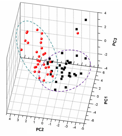 Following the normalized dataset, PCA was applied to 3690 variables of 63 propolis samples to analyze the classification. Each observation (sample) could be represented by each point in the score plots, in which general trends and outliers could be explained visually. The loading scatter plot showed that the magnitude and manners of the variables were responsible for the behavior analysis of individuals. The overall trend of observations in a score plot was influenced by significant variables in the loading plot. The four principle components were extracted from the original data, accounting for over 76.8% of the data in the PCA model. In Figure 4, the PC1/PC2/PC3 score plot illustrates a partial separation between the CMTP and CWTP samples by PC1 of 32.8%, while a clear discrimination is observed in the direction of PC2 of 15.3% and PC3 of 10.2%. CMTP were placed at negative values between −4 and zero of PC2, while CWTP were found at positive values. Two CMTP outliers were observed outside the 95% confidence interval, and one CWTP sample deviated from the clustering of other CMTP samples. It was assumed that contamination of exogenous substances and debris led to the outlier result. In addition, the PCA model could retain the principle information, which was not necessarily important, due to there being no prior knowledge of the dataset. In the specific model, similar information of the chemical compositions could be extracted, while the potential difference was ignored.