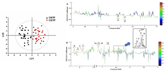 OPLS-DA scores (left) and coefficient-coded loadings plots (right A and B) for the models obtained from the 1H NMR data of CWTP and CMTP. The solid ellipse represents the Hotelling T2 with 95% confidence. The color bar corresponds to the correlation coefficient in the discrimination. The spectral region in the positive section (top half) is indicative of CWTP, while the negative half (bottom half) is indicative of CMTP. Cross-validated with CV-ANOVA, p = 5.57 × 10−2. Metabolite keys to the number are shown in Table S1.