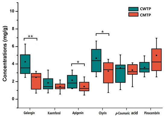 To further reveal the discriminating compositions responsible for classification, the correlation coefficients and VIP values of important variables were evaluated (Table S2). The cut-off values were separately set based on the absolute value of the correlation coefficients (abs (p(corr)) [1]) >0.6 and VIP values >1.2, which are presented in Table S2. Combining with Figure 5, classification was positively correlated with the characteristic signals of CWTP arising from chrysin, apigenin, kaempferol, galangin, cinnamic acid, 3, 4-dimethoxycinnamic acid, p-coumaric acid, caffeic acid, ferulic acid, isoferulic acid, and cinnamyl caffeate, while negatively correlated with the CMTP signals of pinocembrin. Because the characteristic peaks in the 1H NMR spectrum, such as cinnamic acid, 3, 4-dimethoxycinnamic acid, p-coumaric acid, caffeic acid, ferulic acid, isoferulic acid, and cinnamyl caffeate, were susceptible to being overlapped with other compounds, affecting the accurate quantification, the concentrations of other discriminating peaks were calculated relative to the integral areas of TMS and further assessed by the Wilcoxon test with FDR correction (Figure 6). The results revealed that galangin was significantly higher (p < 0.05) in CWTP (4.11 ± 1.86 mg/g) compared to CMTP (2.54 ± 1.13 mg/g), while CWTP had higher chrysin (4.66 ± 2.00 mg/g) and apigenin (2.15 ± 0.78 mg/g) concentrations (p < 0.1) than those (2.95 ± 1.52 and 1.44 ± 0.75 mg/g) of CMTP. The Wilcoxon test with FDR correction showed that the concentration discrimination of kaempferol, pinocembrin, and p-coumaric acid (p > 0.1) between two the geographic propolis did not present obvious differences.