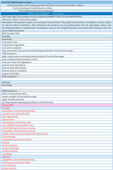 Table 1, Table 2 and Table 3 present a brief view of the last version of the automated database: the professional job profiles related to the food industry, their definition, ISCO numbers and the key skills demanded by these job profiles. All the data here is provided by ESCO. Table 4 demonstrates our contribution to the database: future skills requirements demanded by the mentioned job profiles. These newly introduced skills are mainly transversal and technological ones generated by Industry 4.0 and they are highlighted in the red colour since they represent our addition to the database. We used 7 job profiles as an example. The complete version of the documents, Table 1, Table 2 and Table 3, can be found in the Supplementary Materials as Figures S2–S4 respectively.