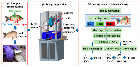 The purpose of this study was to apply hyperspectral technology to realize the nondestructive detection of the scaling rate of carp. The hyperspectral imaging system was set up to obtain the spectra of each image pixel in the visible and near-infrared wavelength range (387.1–1024.7 nm). The specific objectives of the study were to: (1) realize the spectral preprocessing and characteristic wavelength (CW) selection using different methods; (2) establish the scaling rate detection model using full wavelength (FW) and CW; (3) select the most suitable model for scaling rate detection.